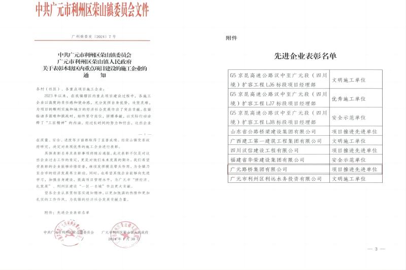 1月30日,公司收到利州區(qū)榮山鎮(zhèn)委員會、榮山鎮(zhèn)人民政府發(fā)來的關(guān)于表彰本轄區(qū)內(nèi)重點項目建設(shè)的施工企業(yè)的通知{廣利榮委發(fā)(2024)7號},路橋集團被點名表彰,路橋集團榮山鎮(zhèn)高坑口至周家壩項目部在面對建設(shè)前期諸多困難和挑戰(zhàn)時,迎難而上,發(fā)揚拼搏奉獻,以實際精神詮釋了“工匠精神”的內(nèi)涵。